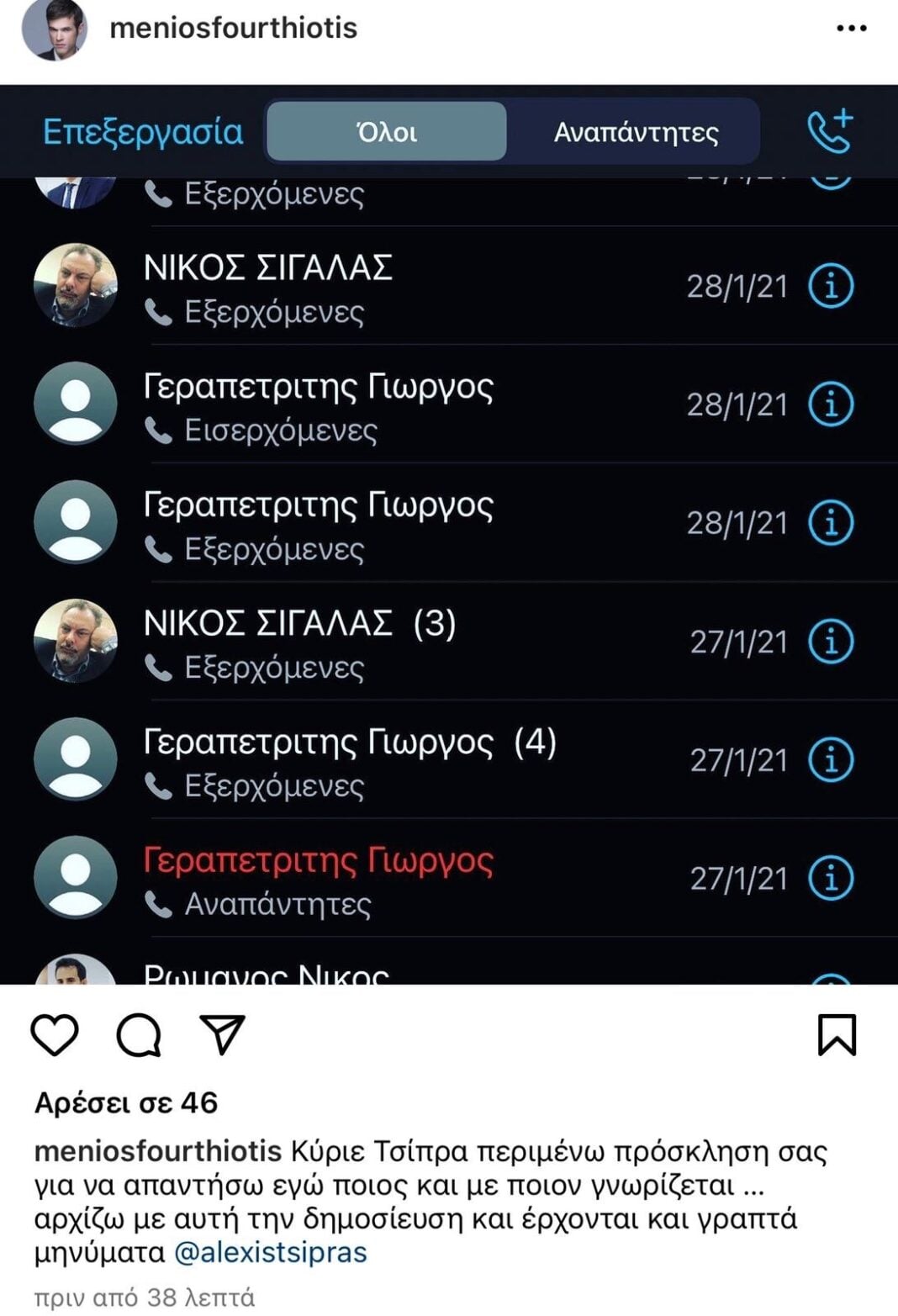 Πριν από λίγο λοιπόν ο Μένιος Φουρθιώτης έδωσε στην δημοσιότητα τηλεφωνικές του συνομιλίες με τον Υπουργό επικρατείας Γιώργο Γεραπετρίτη και τον διευθυντή του γραφείου τύπου της Νέας Δημοκρατίας, Νίκο Ρωμανό.
