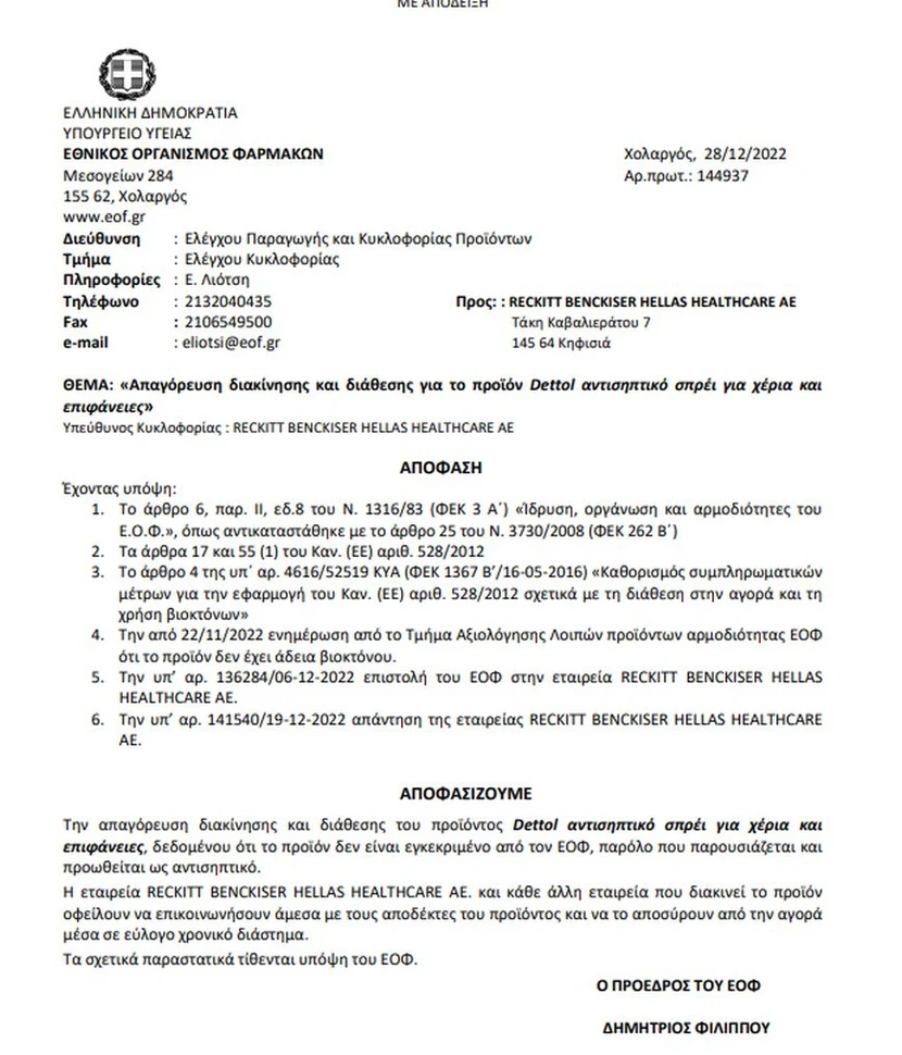 Tην απαγόρευση διακίνησης και διάθεσης του προϊόντος Dettol αντισηπτικό σπρέι για χέρια και επιφάνειες, δεδομένου ότι.... το προϊόν δεν είναι εγκεκριμένο από τον ΕΟΦ, παρόλο που παρουσιάζεται και προωθείται ως αντισηπτικό.