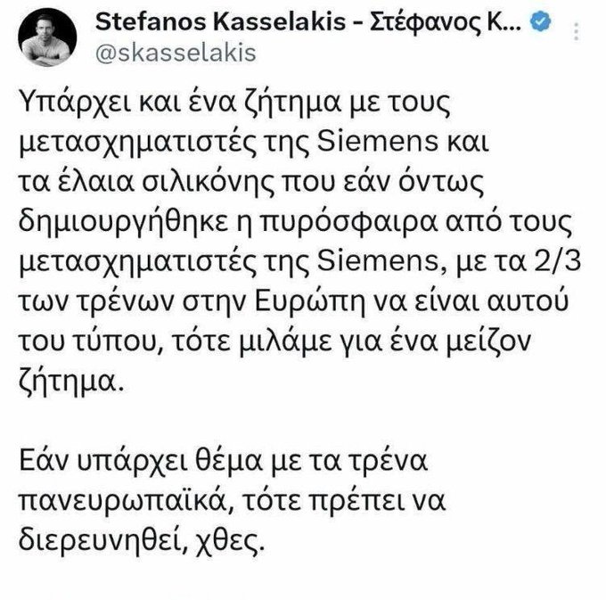 «Υπάρχει και ένα ζήτημα με τους μετασχηματιστές της Siemens και τα έλαια σιλικόνης που εάν όντως δημιουργήθηκε η πυρόσφαιρα από τους μετασχηματιστές της Siemens, με τα 2/3 των τρένων στην Ευρώπη να είναι αυτού του τύπου, τότε να μιλάμε για ένα μείζον ζήτησμα. Εάν υπάρχει θέμα με τα τρένα πανευρωπαϊκά, τότε πρέπει να διερευνθεί χθες», ανέφερε στην ανάρτησή του ο κ. Κασσελάκης.