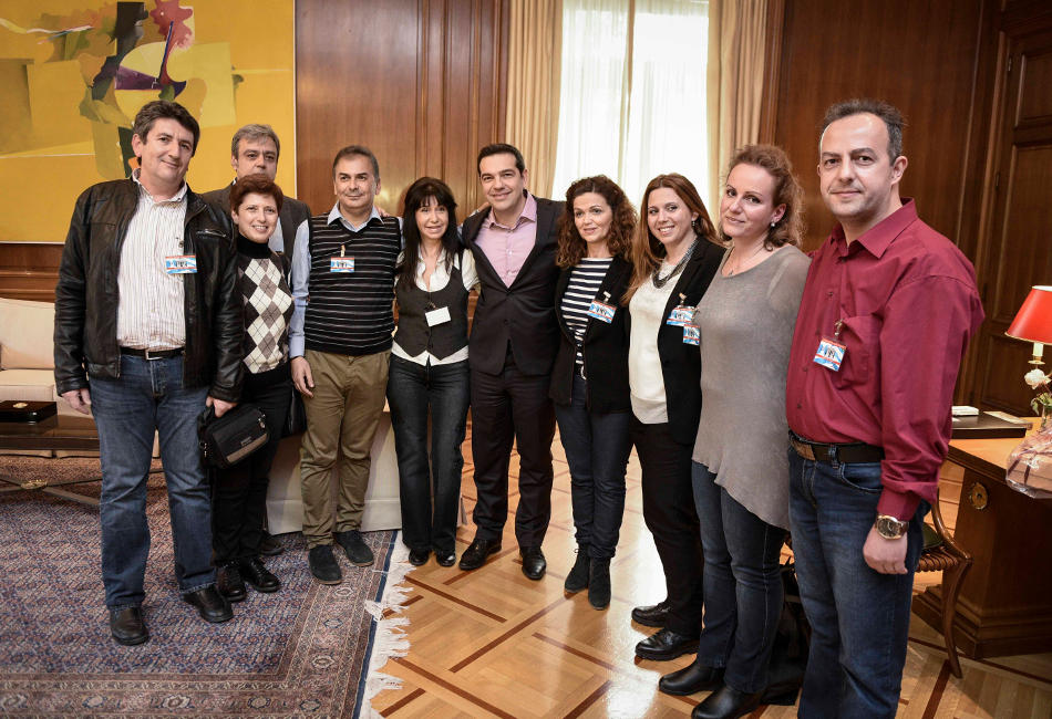 [αντιπροσωπεία των επιτυχόντων του διαγωνισμού του ΑΣΕΠ του 1998 χαμογελούν πανευτυχείς μαζί με τον πρωθυπουργό άμα τη ανακοινώσει ότι ο επιμορφωτής μη προσοντούχων δημοσίων υπαλλήλων υπουργός κ. Βερναρδάκης [brand name SYRIZA] τους